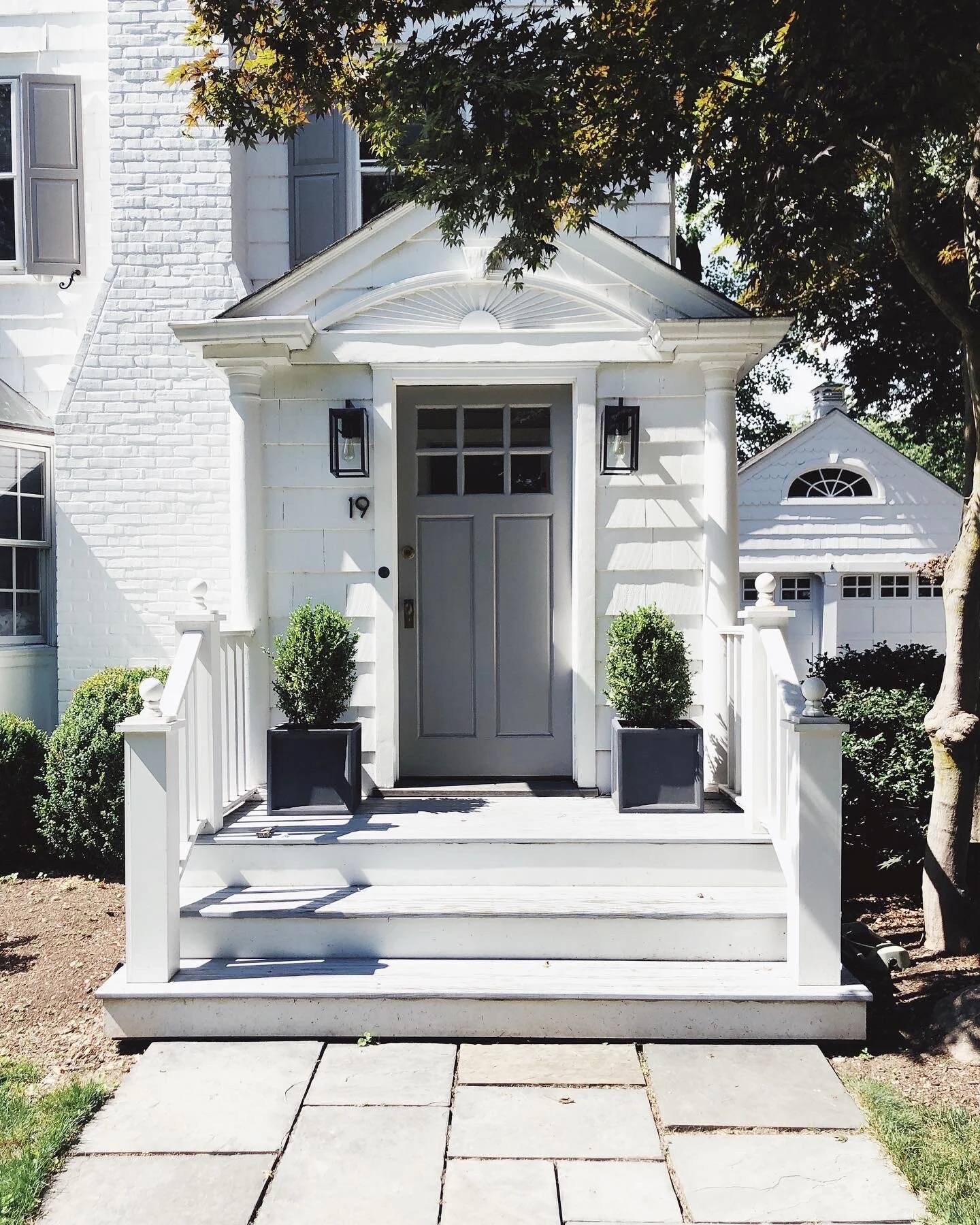 The color of our front door is Galveston Gray by Benjamin Moore. I love the color! It took me a long time to find this gray - not too dark, but also not too light especially in the sun. We used a super high-gloss paint from Fine Paints of Europe which is easy to clean and still gives it a really fresh feel four years later. You can read more about the paint colors we’ve used in our house HERE.